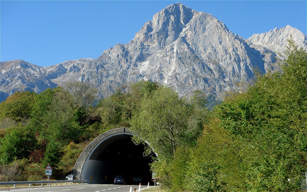 The Laboratorie Nazionali del Gran Sasso (LNGS), accessed via the Traforo del Gran Sasso freeway tunnel.